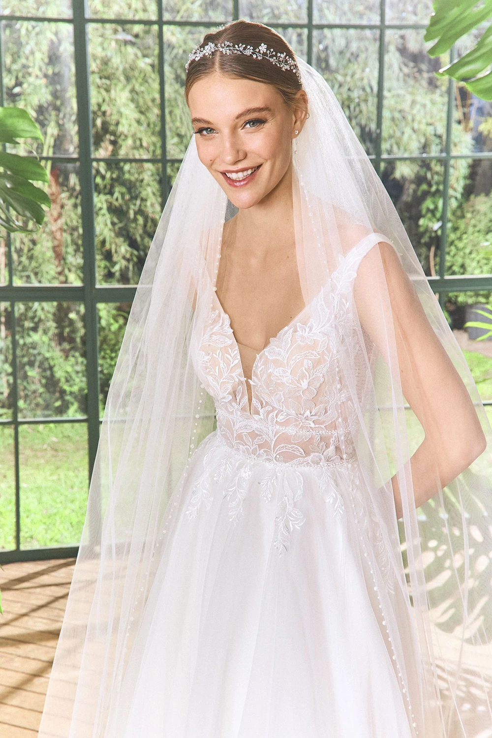 Das Modell Jovem von White One ist ein leichtes A-Linien Brautkleid mit einem semitransparenten Oberteil aus zarter Spitze und einem Softtüllrock.