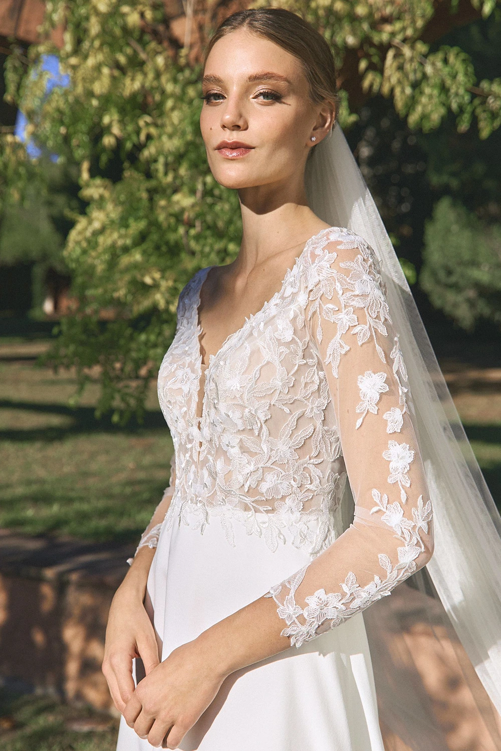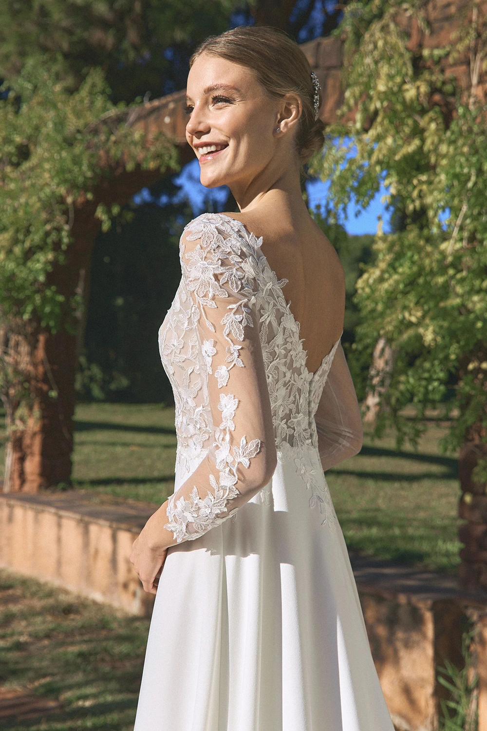 Das Modell Sorisso von White One ist ein leichtes A-Linien Brautkleid mit einem langarm Oberteil aus floraler Spitze und einem tiefen V-Ausschnitt am Rücken.