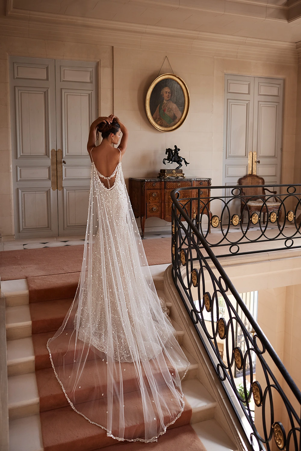 Das Modell Arianna von Yedyna ist ein glamouröses Fit und Flare Brautkleid mit einem tiefen V-Ausschnitt und funkelnder Spitze, welche über das gesamte Kleid verteilt ist.