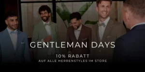 Nutze deine Chance auf 10% Rabatt* für deinen Hochzeitsanzug während unserer Gentleman Days vom 23. bis 27. März 2026. und 30. März bis 3. April 2026. Erfahre alles über deine Aktions-Vorteile in diesem Beitrag.