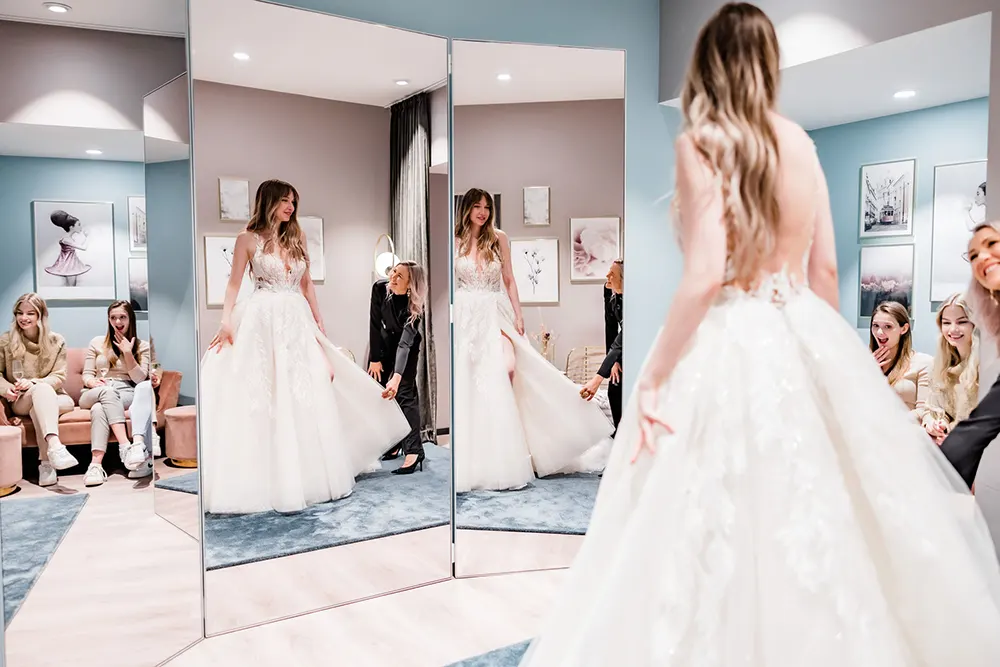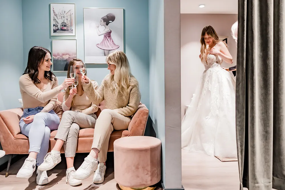 Es ist absolut verständlich, dass Du zusammen mit Deinen Liebsten das Brautkleid aussuchen möchtest. Da es sich an diesem Tag allerdings vollkommen um Dich dreht, möchten wir darum bitten, dass sich Deine Begleitpersonen während Deiner Suche nach Deinem Traumkleid in eurer Suite entspannen und gespannt darauf warten, wofür Du Dich entschieden hast. Solltest Du dir bei der Anprobe eine Alternative wünschen, dann wird dir Deine Fachberaterin gerne eine passende Alternative holen.